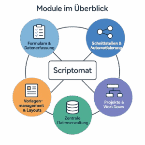 Scriptomat besteht aus fünf Modulen, die sich nahtlos miteinander verbinden. Jedes Modul erfüllt eine spezifische Aufgabe im Dokumentenprozess – von der Datenerfassung bis zur automatisierten Freigabe. Gemeinsam bilden sie eine skalierbare Plattform für effiziente, sichere und durchgängig digitale Dokumentenerstellung.
